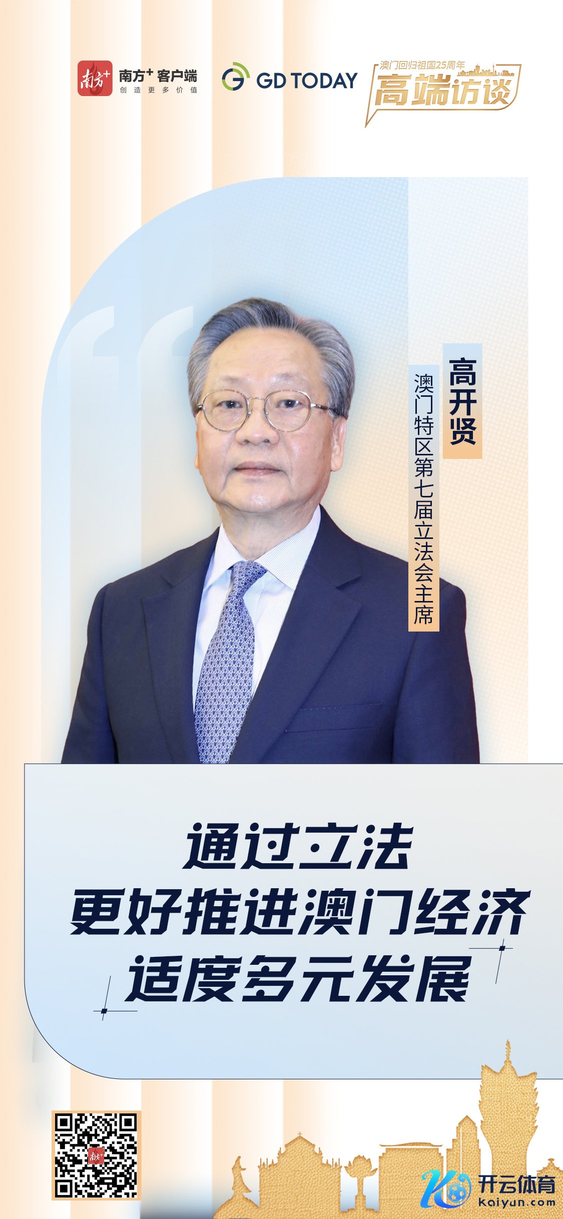 高开贤:澳门追溯故国25年来,在中央政府的矍铄指点和支援下,澳门特区政府历任行政主座指示下,澳门在政事、经济、社会、民生等方面都取得了一定收成。当作特区立法机关,立法会长久严格死守基本法赋予的职责,全面准确贯彻“一国两制”主义,并与特区政府有用配合。
