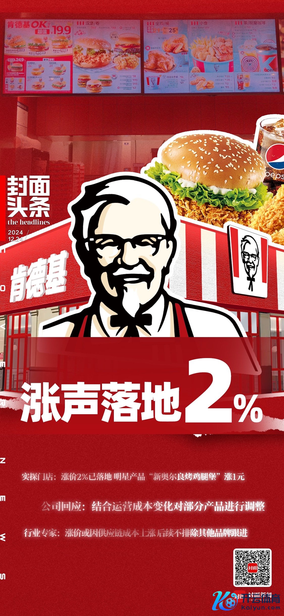 12月24日,有市集音问称肯德基启动了调价,平均涨幅为2%,具体出动领域在0.5元至2元不等,这是该品牌近两年来初次居品价钱出动。