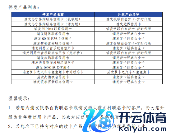 具体停发产物有:浦发苏宁易购联名信用卡(银联版)、浦发苏宁易购联名信用卡(活力版)、浦发 VIPlus 定约信用卡、浦发腾讯联名信用卡、浦发 QQ 钱包联名信用卡、浦发樊登念书联名信用卡、浦发网易云音乐联名信用卡、浦发网易云音乐联名信用卡(免年费)、浦发旅购联名信用卡、浦发西贝莜面村联名信用卡、浦发 0PP0 联名信用卡、浦发梦卡之汽车车主主题卡中升联名卡、浦发高德联名信用卡、浦发银泰百货联名信用卡